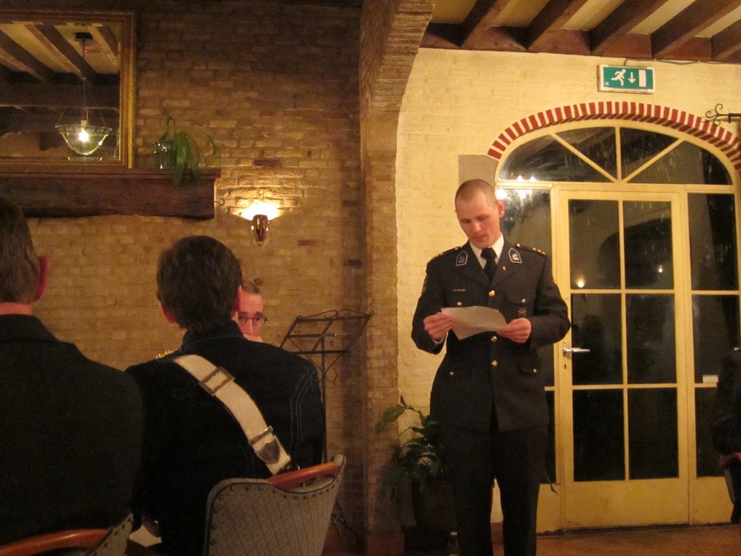 Hij vraagt Dennis Boom naar voren te komen. Geen huzaar van Sytzama, maar scherp, flitsend en altijd aanwezig. Voor zijn vele verdiensten als fotograaf verdient hij de Regimentspenning. Dennis krijgt de legpenning samen met een fraaie oorkonde. Een huisgemaakte brownie met een bosvruchten coulis, saus van amandelspijs en vanille roomijs is het nagerecht. Dan is het de hoogste tijd voor de jaarlijkse bijdrage van Jelle de Jong die ook nu weer de tocht vanuit zijn onderkomen in het hoge Noorden van Friesland, aan de Waddenzee, heeft ondernomen. Jelle vertelt dit jaar niet over Aladin en zijn 40 rovers, over Lenie, over bultruggen of over boer Gerrit. Het voorbije jaar was een mooi jaar met voor het regiment hoogtepunten, maar voor hem persoonlijk geen prijs in de staatsloterij maar wel de zekerheid van een woekerpolis (hilariteit). Onze oprichter heeft ons devies meer dan waargemaakt.