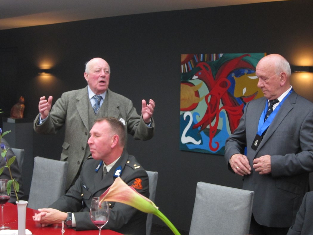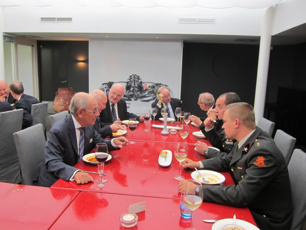 Jurgen en Elise, de uitbaters van De Waag, hebben beslag weten te leggen op een Spaans Iberico varken en laten van het vlees proeven samen met aardappelen, spinazie en truffelsaus. Voor Jan Lakeman is er een scholletje. Tuur is aan het eind van de week echt jarig en bied het tweede glas wijn aan. Er wordt intensief met elkaar gesproken. Er zijn er die gekomen zijn om wat tegen een ander te zeggen die niet naast hem aan tafel zit. Daardoor ontstaat er beweging tijdens de lunch. Dat stoort niet en gaat niet ten koste van de onderlinge camaraderie. Onrustig, noteer ik, maar het maakt de lunch niet minder gezellig. Stef Laarman krijgt het woord. Hij vertelt dat zijn officieren en hij zich hier thuis voelen, onderdeel zijn van deze lunch. Hij prijst de belangstelling voor het onderlinge wel en wee. De aanwas is beperkt, dit jaar zijn er drie cavalerieofficieren van de KMA gekomen en bij de eerstejaars hebben zich zes voor ons wapen gemeld. Stef vertelt over de bijzondere constructie waardoor Nederland weer over tanks beschikt. Onze tanks komen, na een omweg, bij de Duitsers terecht die ze upgraden naar Leopards 2A7’s waarna onze krijgsmacht ze terug leaset.