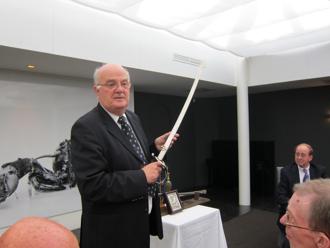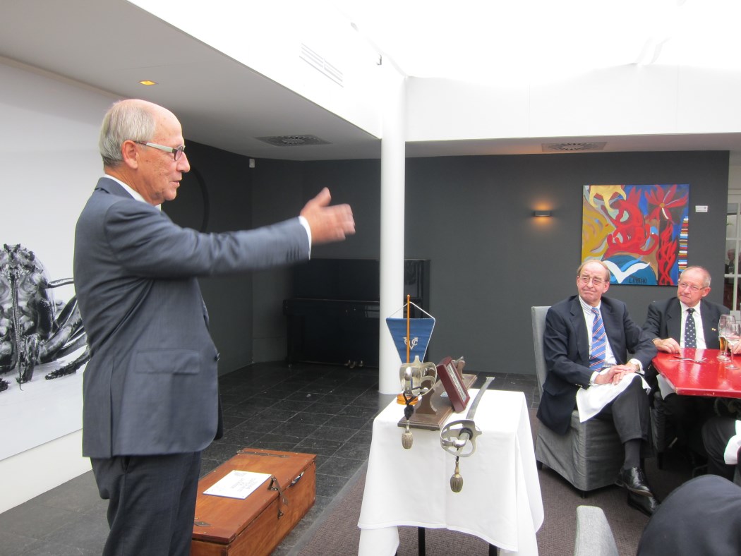 Ook John Mantingh heeft nog een mededeling. Dat betreft het erelid Rob Goldman. Bij Rob is een kleine ingreep gepleegd. Dat is niet helemaal goed gegaan en Rob heeft een week in het ziekenhuis gelegen. Is weer thuis geweest maar gisteren kreek John het bericht dat Rob weer in het ziekenhuis ligt. De vorige ICD (implanteerbare cardioverter defibrillator) van Dirk gaat van hand tot hand. Tuur van der Pas gaat bij het tafeltje met de sabel, vlag en andere parafernalia staan. Hij vertelt dat de lichting 66-4 van de SROC na 15 jaar voor het eerst een reünie hield. Sindsdien komen ze ieder jaar bij elkaar. Deze zomer waren ze weer bij elkaar in Friesland en 14 klasgenoten waren daar als gasten van Tuur. Hij wijst op het tafeltje waarop nog een sabel ligt en geeft het woord aan Matthijs Snouck Hurgonje . Die vertelt over het bivak in Eernewoude op een landgoed van 64 ha. Er werden verschillende vervoermiddelen ingezet, boot, bus en auto. Het afsluitend zevengangen diner was bij Lauswolt.